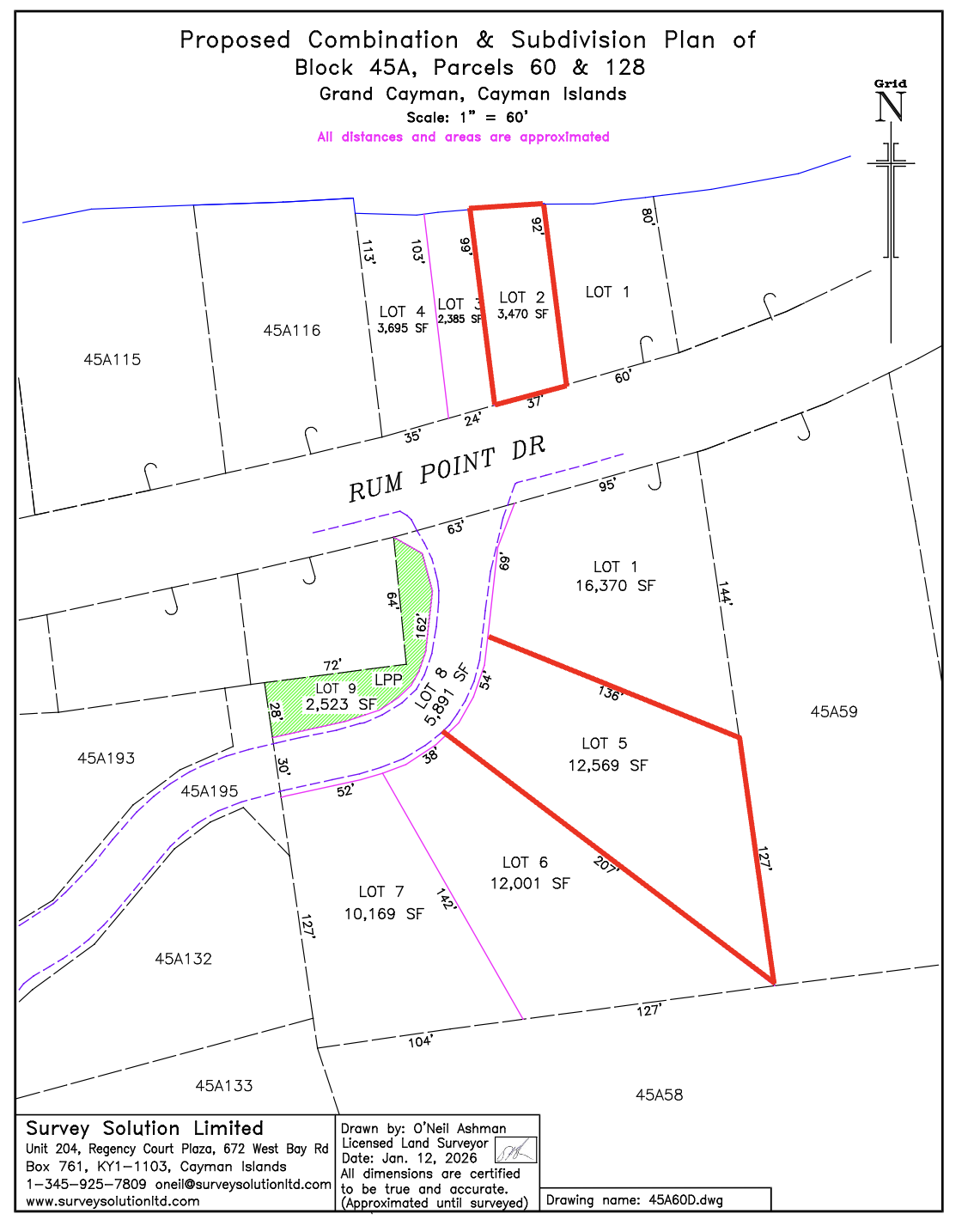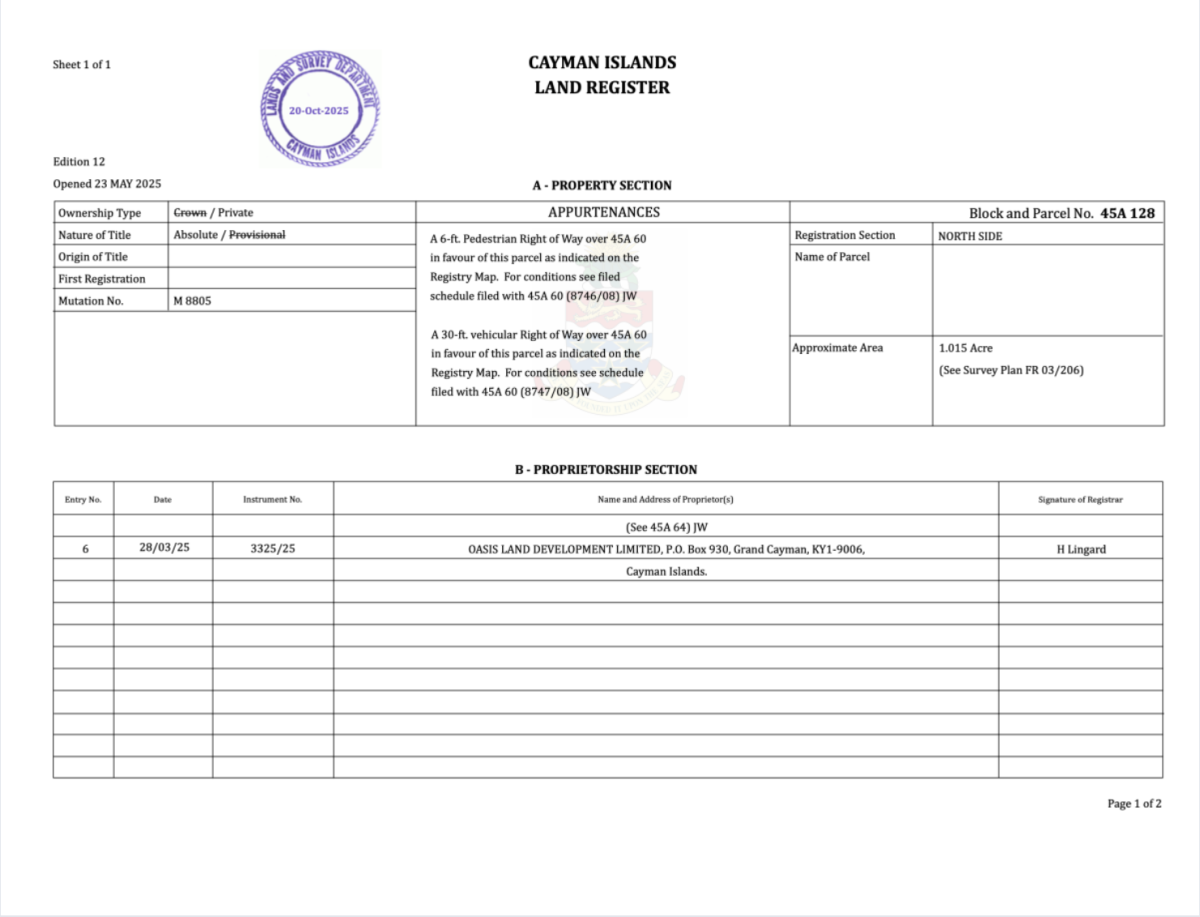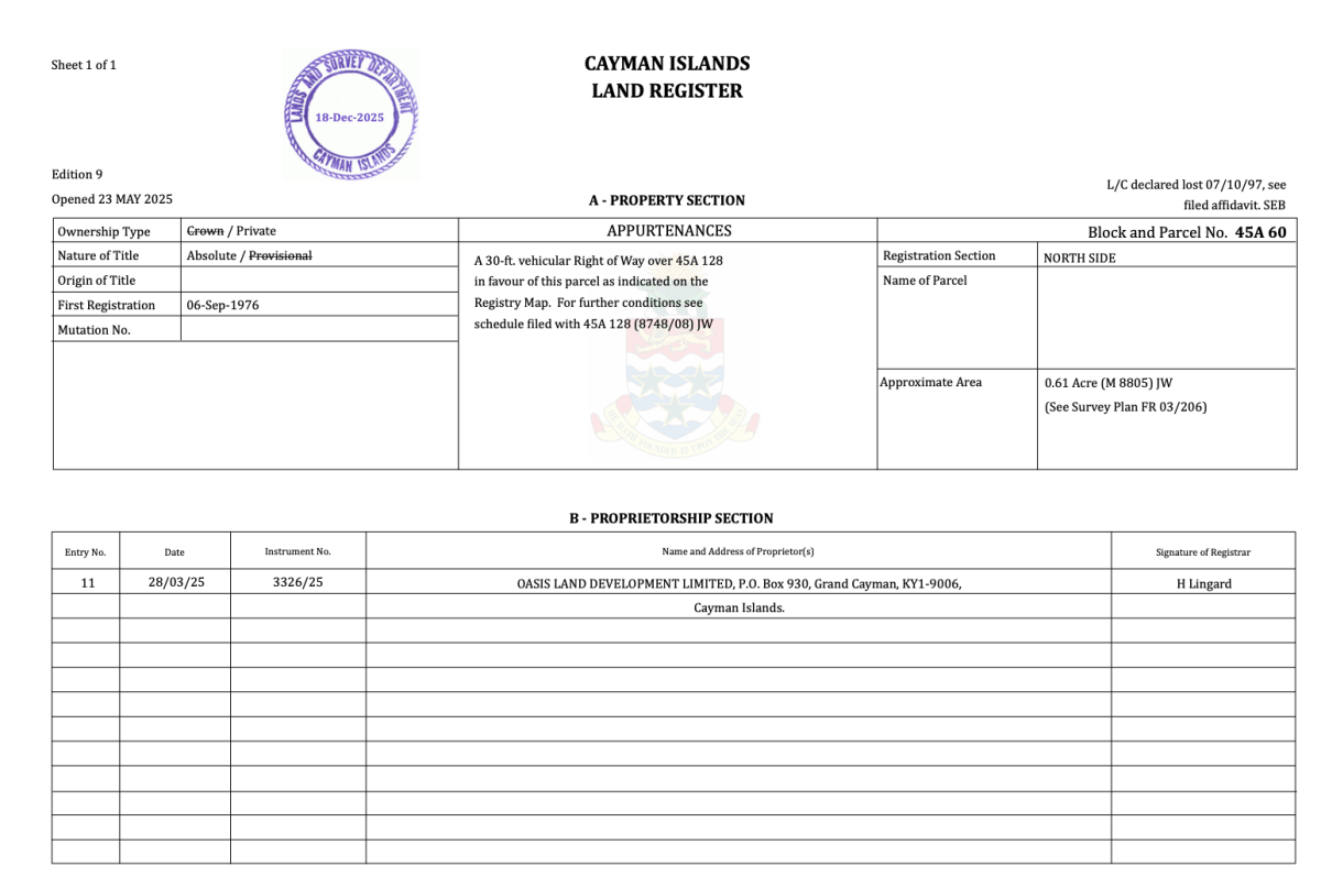 | Final Parcel IDs | This parcel is currently formally registered as Block 45A Parcel 60 & 128 with the Cayman Islands Government Land Registry (Pre-subdivision) | Confirmed |