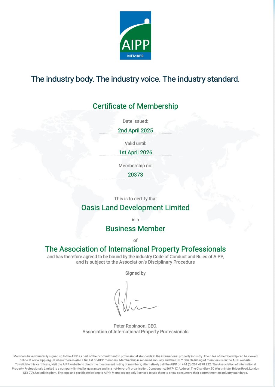 AIPP Certificate - Oasis Land Development holds AIPP Accreditation (Association of International Property Professionals), confirming our ten-year commitment to operating with integrity.