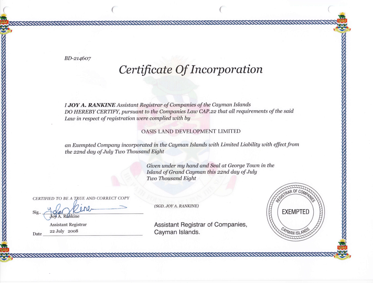 Certificate of Incorporation - Registered in the Cayman Islands 22nd July 2008