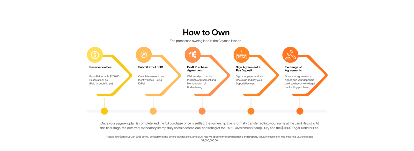 All rates are subject to change by the Cayman Islands Government. If you choose to develop the land before transferring the title, the Stamp Duty will be calculated on the combined value of both the land and the property.