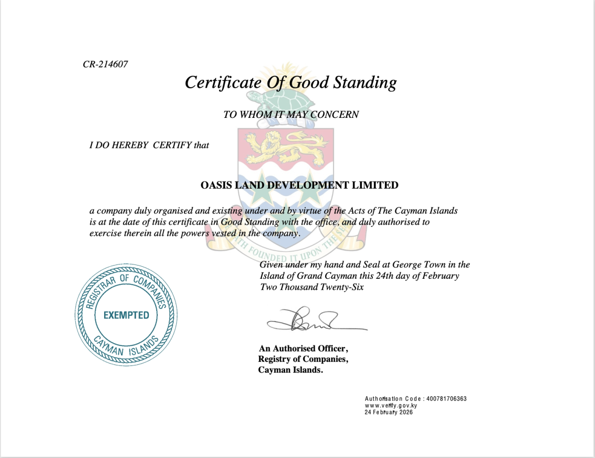 Certificate of Good Standing - Authorisation code 400781706363 - Government verification link www.verify.gov.ky
