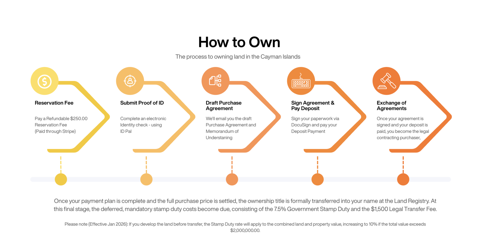 All rates are subject to change by the Cayman Islands Government. If you choose to develop the land before transferring the title, the Stamp Duty will be calculated on the combined value of both the land and the property.